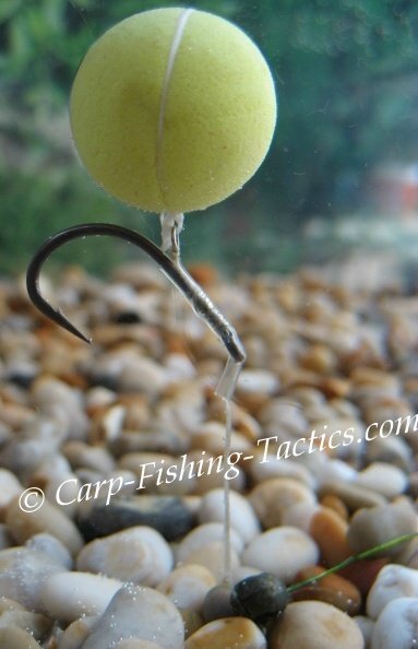 This carp fishing rig is best to use with pop ups as they help give the hook that claw position. A bottom boilie bait will not allow the rig to work effectively.
