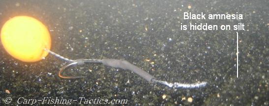 An overhead view of the combi carp rig in silt. A bright coloured bait really shows up well on silt. Good visible boilies may be needed in order to draw in any passing fish. Yes, some carp may spook off bright bait, but this is generally when there's a large mass on the bottom. A single boilie, or even a couple of brightly coloured boilies, won't spook the majority of carp because it's this situation they have learned to associate as safe. When an angler packs up, the bait he threw in will usually disappear gradually until there are only a few scatterings of boilies left in the swim. When a carp feeds on these few baits, it hardly ever gets caught because the angler has gone. The only exception to this is if another anglers jumps straight into the swim after him.